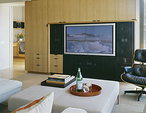 Architecturally integrated home theater, featuring a Fujitsu 55" reference plasma monitor, Reference Atlantic Technologies speakers and an IP-based music system.