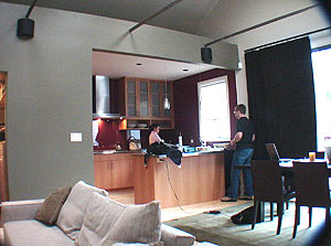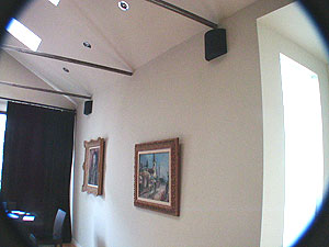 Artison LRS surround speakers blend unobtrusively with the interior look. The cables were run through the metal trusses you see here