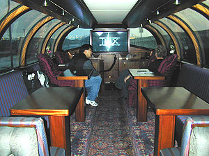 The dome of this luxury private railcar is equipped with a 42" plasma resting on custom mounts. When not needed, the plasma disappears into the cabinet below.